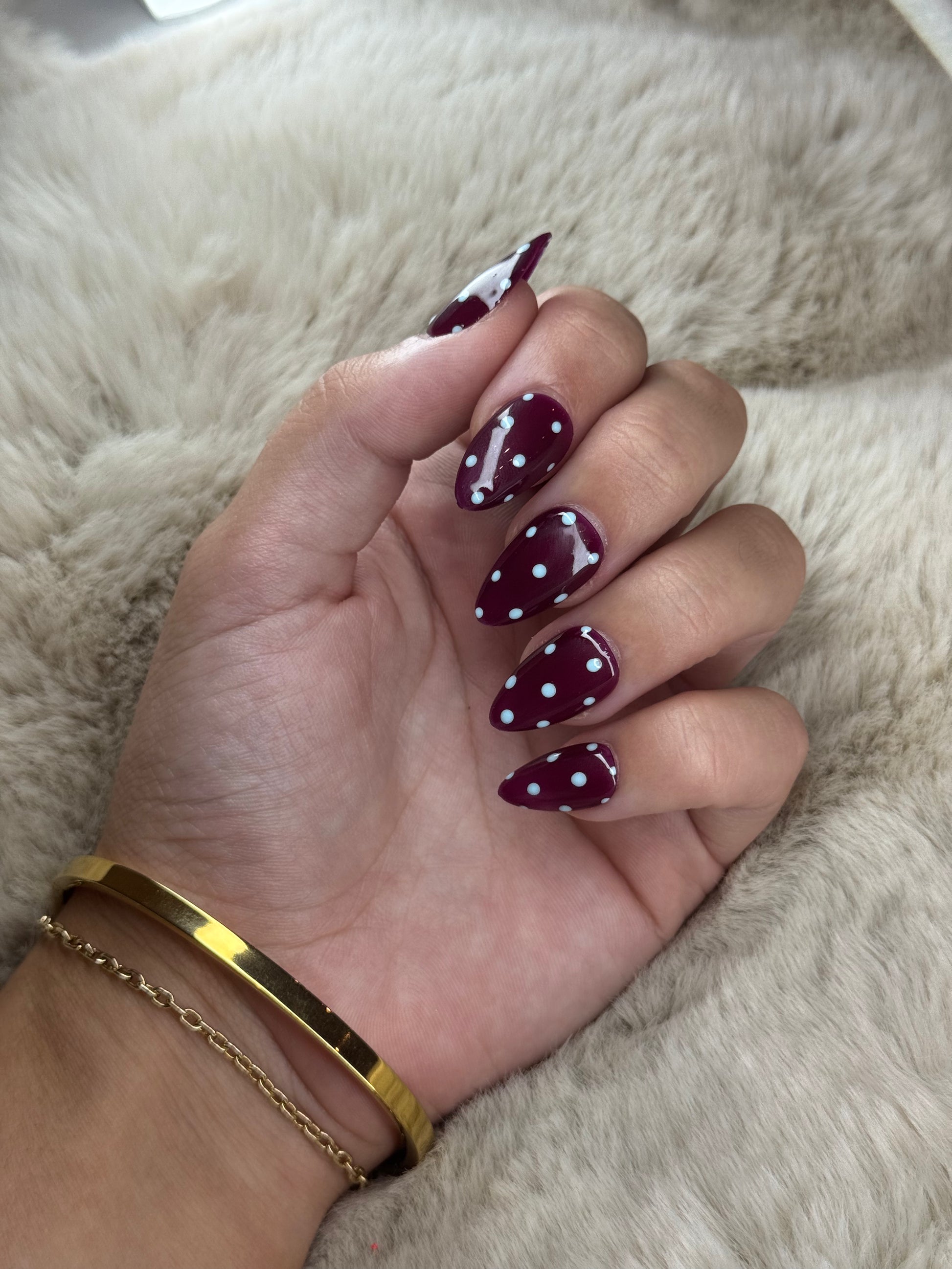A deep red with a purple hue and perfect baby blue polka dots with a glossy finish.